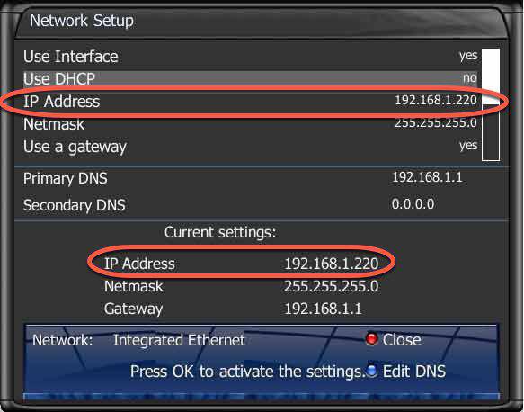 Step 2: To connect, we need to know the box IP address, username, and password (username and password usually is root/root). Now about the IP, click Menu button on the remote controller. Go to Setting then Network Settings. You should see something like the below image: