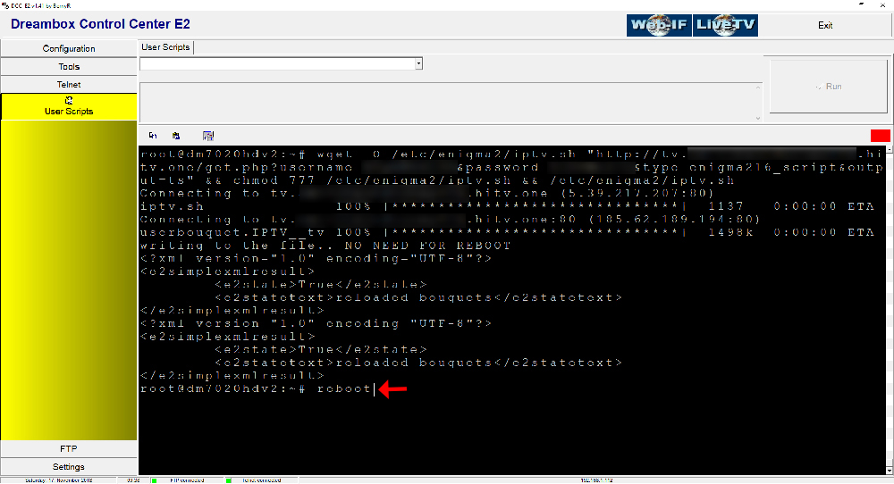 wget -O /etc/enigma2/iptv.sh “http://tv.yourdns.com/get.php?username=your-line-username&password=your-line-password&type=enigma216_script&output=ts” && chmod 777 /etc/enigma2/iptv.sh && /etc/enigma2/iptv.sh