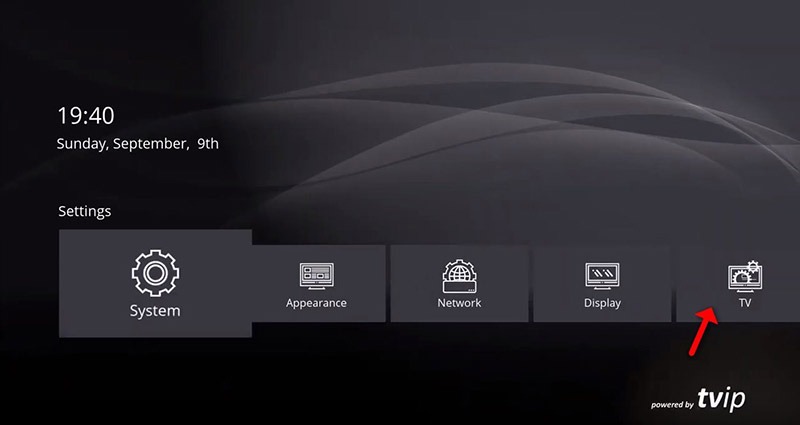 Step 1: After run the TVIP box and set the primary setting like language and time, Start from the main menu and go down to see the “Setting” and click on “TV” as depicted in the below picture.